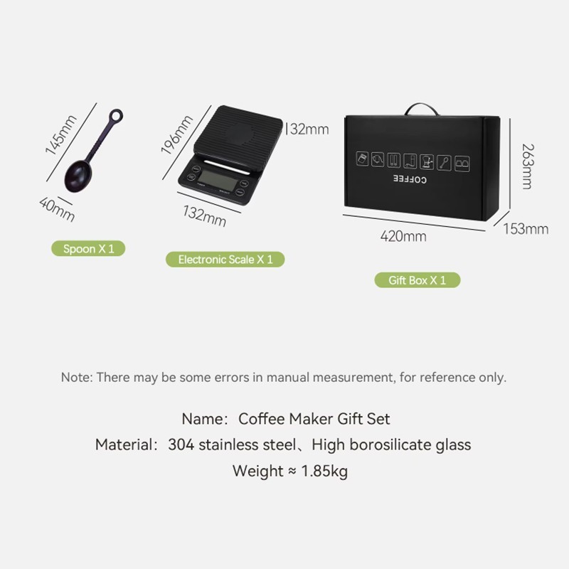 Includes a hand grinder, gooseneck kettle, pour-over glass carafe, reusable stainless steel filter, two glass mugs, two coffee bean tubes, spoon, and digital scale — delivering professional-grade precision and full control of the brewing process.